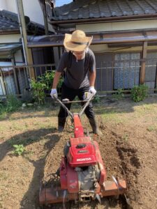 とても暑い時間帯の中で耕運機を使って硬い土を耕すことをしながら肥料を撤いて、土を柔らかくしながら何回も・・何回も繰り返して行くと『土』が出来上がります。