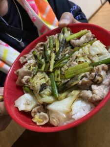 大好きなのは、脂ののった豚肉、キャベツ、にんにくの芽を入れて、