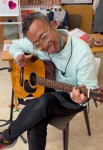 ここで、ぼくにとっては大きな出来事が訪れることになったのです。会場には椅子の上に1本のアコースティックギターが置かれており、【自由に弾いてください。】の貼り紙!!そこでスタッフのみつやさんから「ひろむ、あのギターを弾いてきなよー。」と。ぼくの心臓はもうドキドキ&バクバク💓「でも恥ずかしいし、緊張しますよ――っ。」と伝えると、「恥ずかしい時こそやらなくちゃ!!」と背中を押してもらい、ギターの所へ👣いつものように椅子に座り、左足を組み、ギターを抱きました。ぼくが母から教えてもらったのがきっかけで弾き始めたギター♬今回ぼくが弾き語り(指弾き)をしたのは、テレビ『裸の大将』のテーマソング『野に咲く花のように』です。もうとにかく、めっちゃくっちゃ恥ずかしくて汗をかきましたよ💦でもでも、途中からはたくさんのひとたちの前で大好きなギターを弾くことに快感を覚えていきました✌それからは名古屋ダルクのブースに戻りましたが・・・しばらくすると、またみなさんの前でギターを弾きたくなり、ギターの元へ🎸2曲目は坂本九の『見上げてごらん夜の星を』(^^♪。。。もう2曲目からは快感でしかなかったです(^ε^)